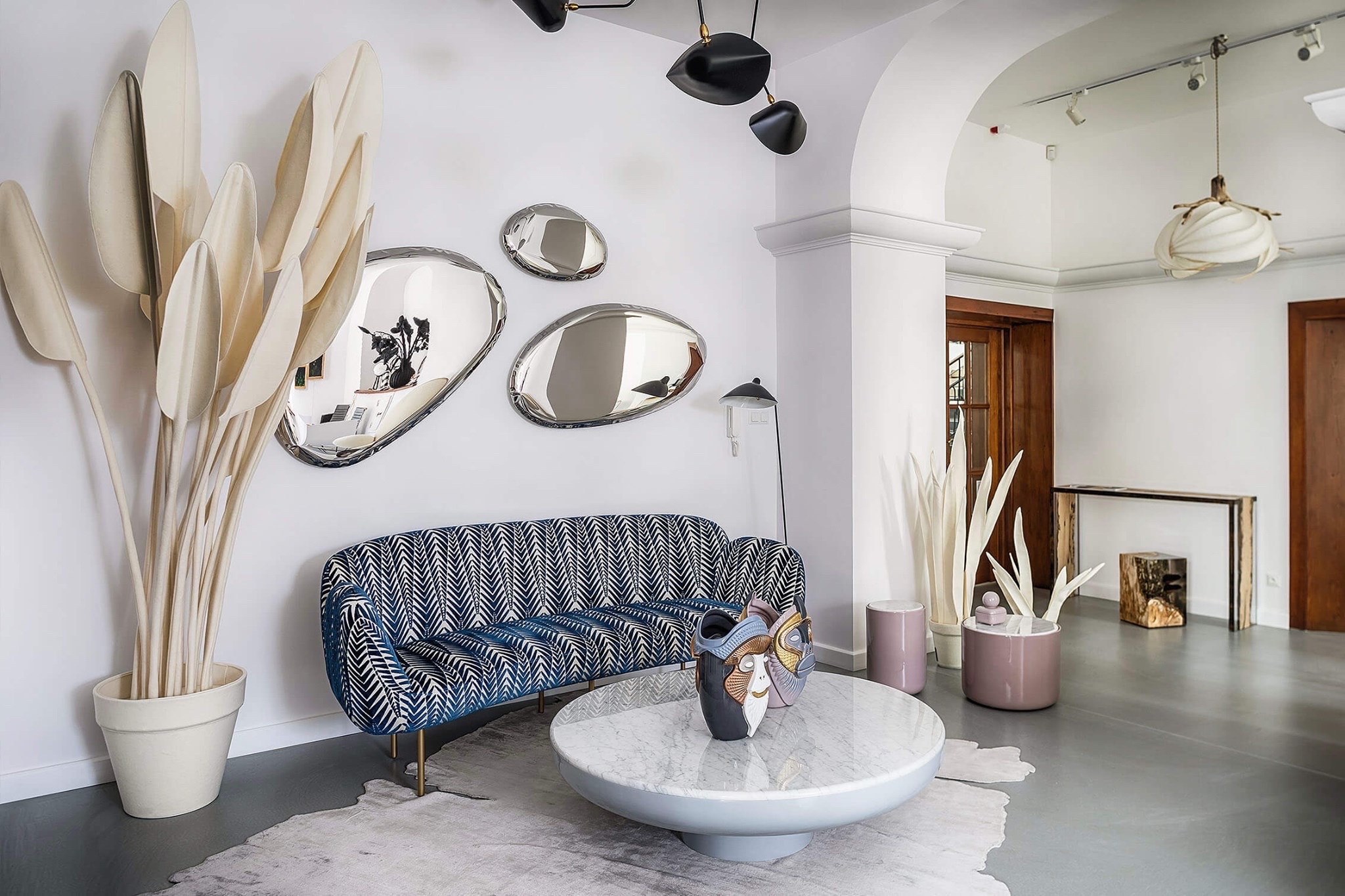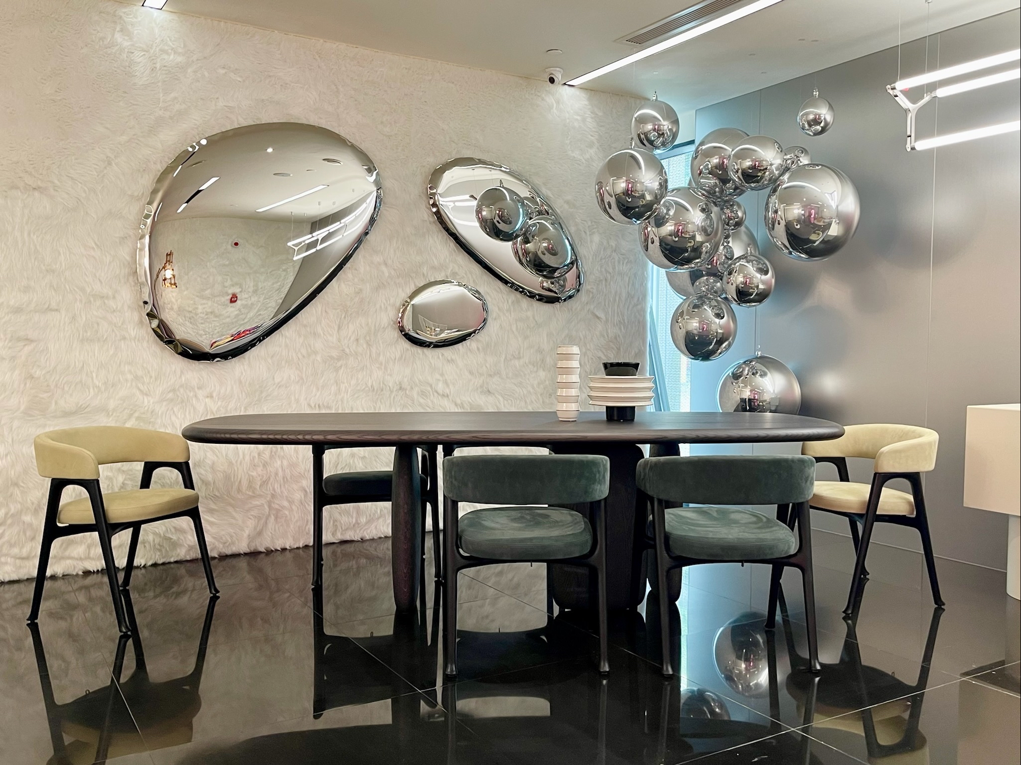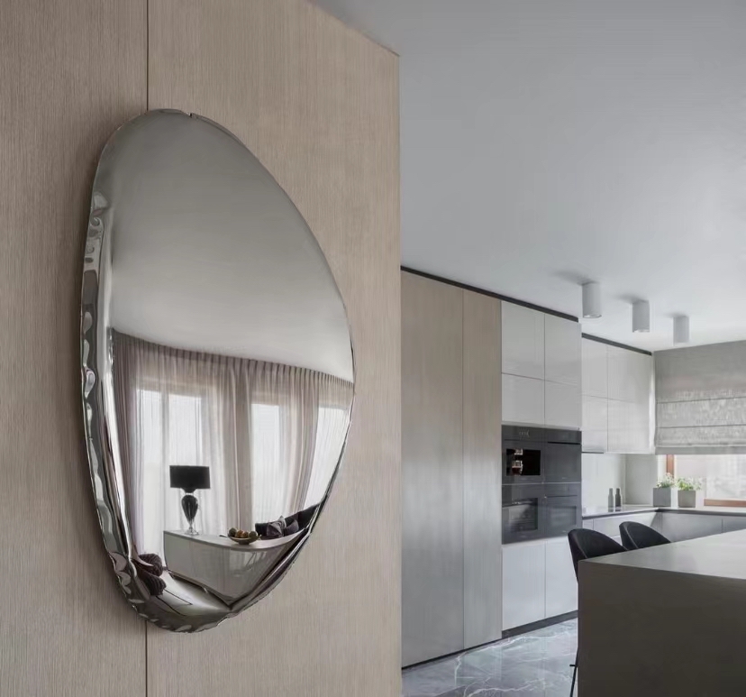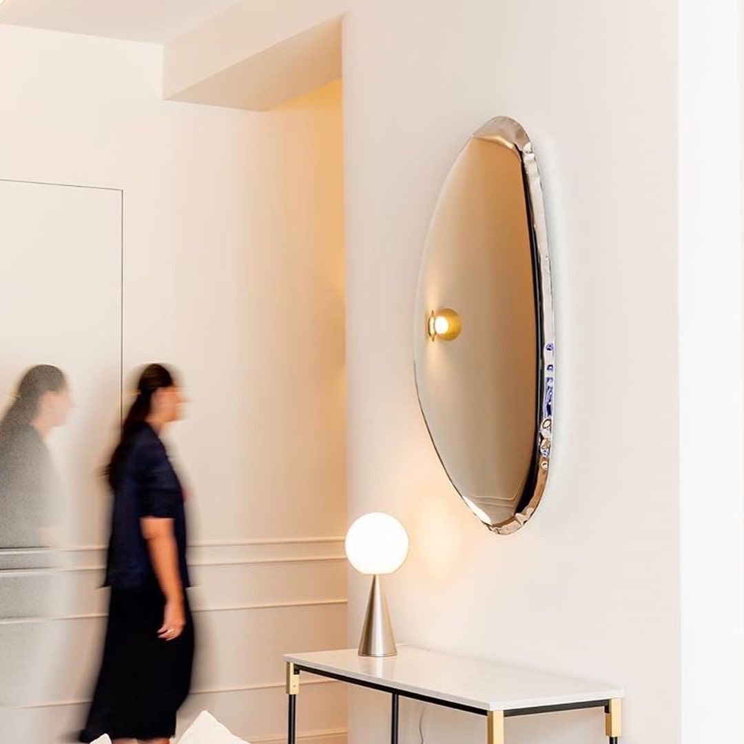 TAFLA O is a series of bionic mirrors of organic shapes inspired by natural shapes of liquid drops. Mirrors from the TAFLA collection are made of stainless steel polished to a high gloss and come in seven different sizes. They can be arranged in an artistic personalized composition or exposed on a wall as a single sculpture-like mirror. They will fit contemporary private spaces, as well as restaurants, bars and hotel rooms. You can enjoy the charm of the classic Inox finish or a colour selected from the available palette. The TAFLA O mirror looks mesmerizing as a single object, but also in layouts that make up constellations of them.